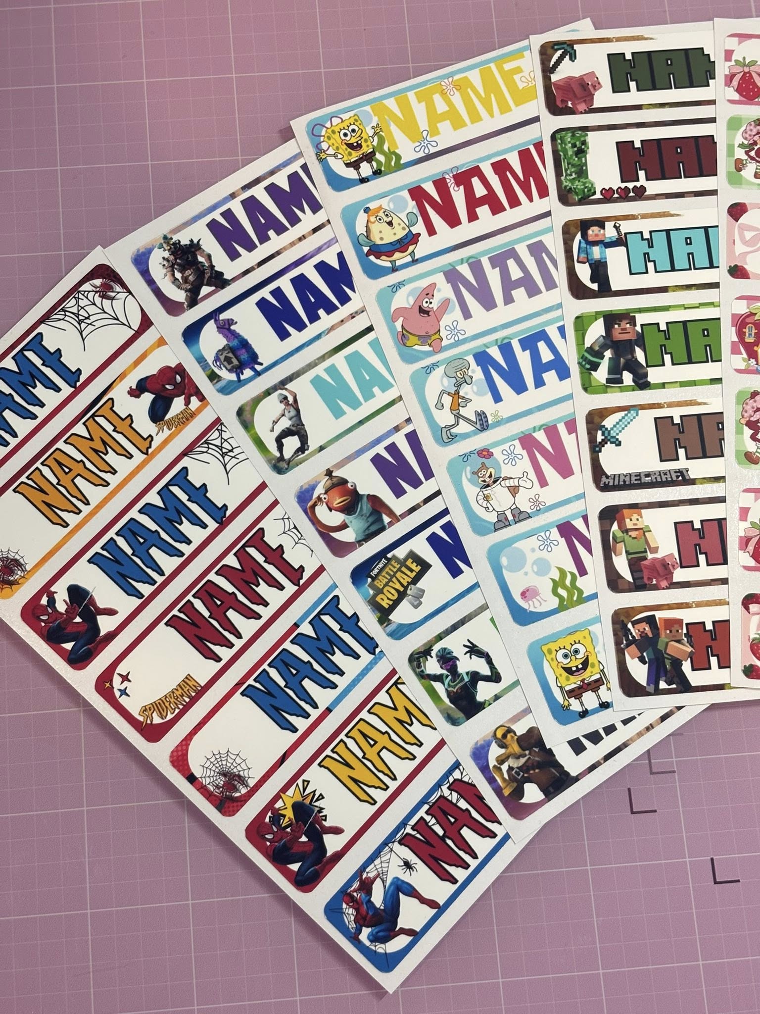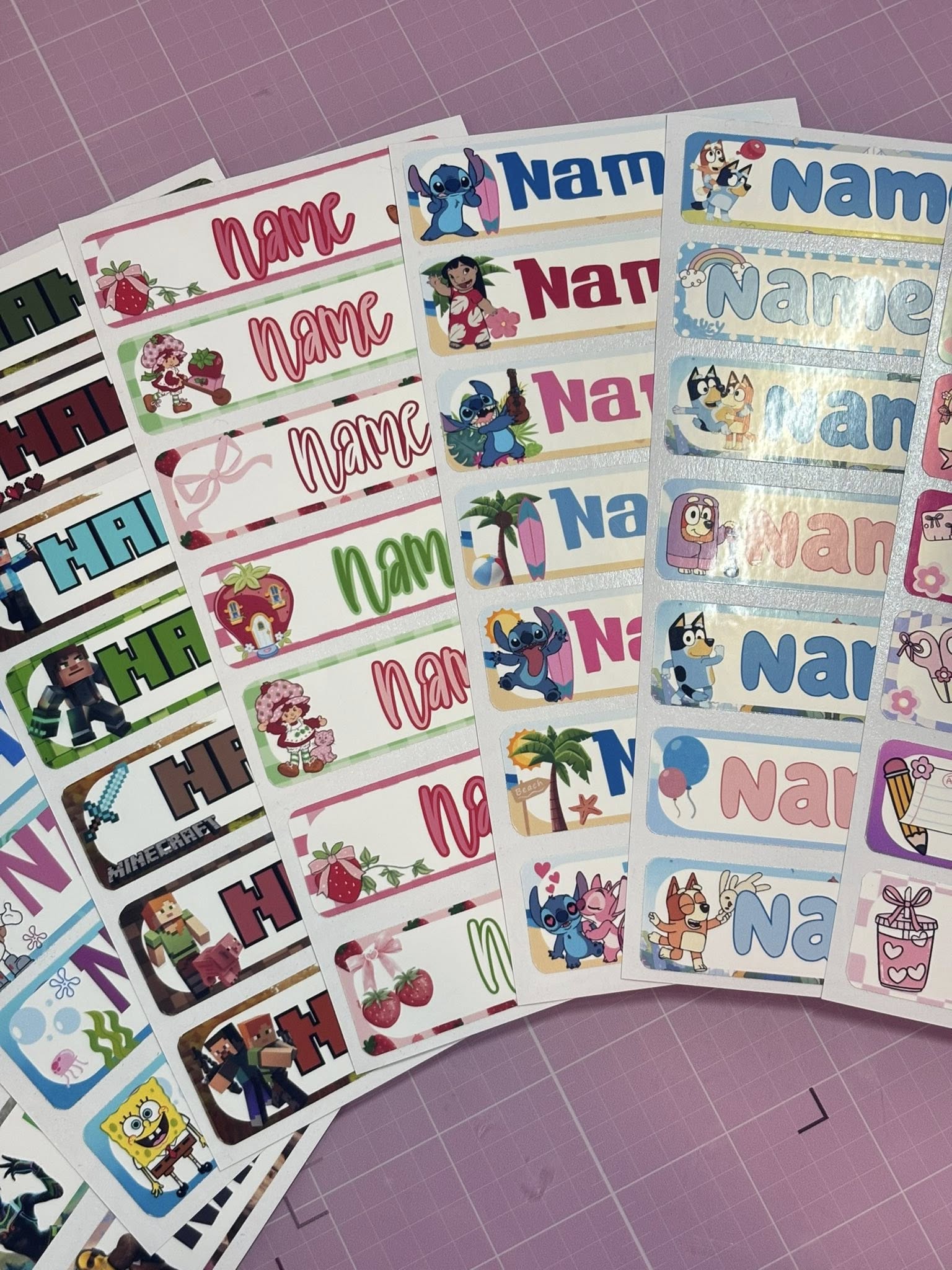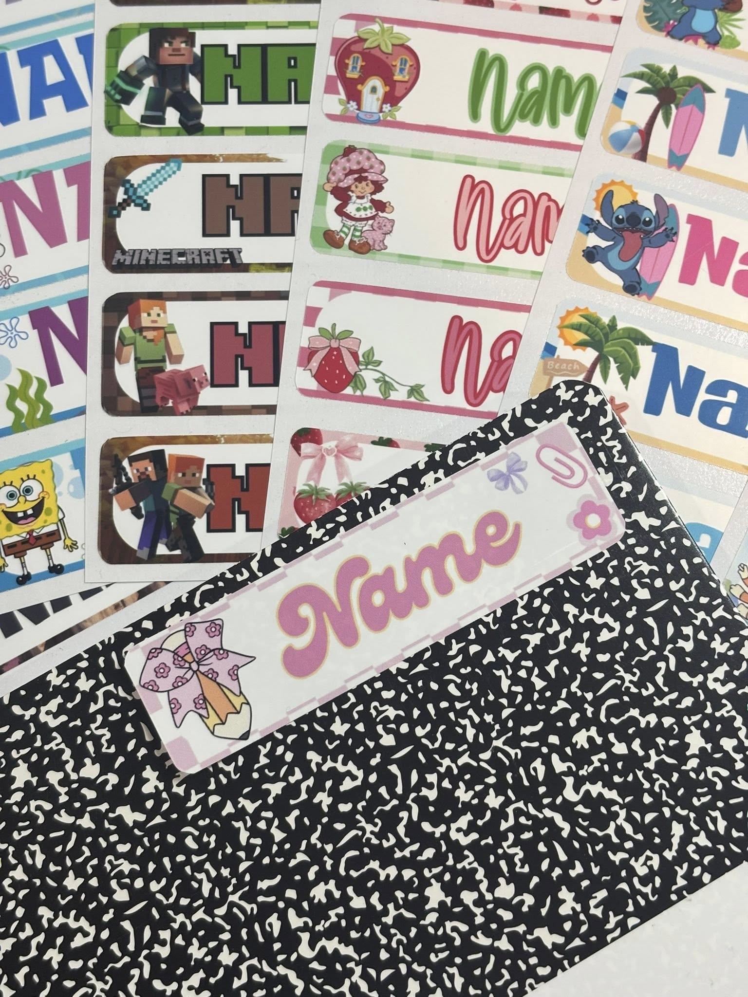 turn ordinary school supplies into personalized treasures! Our custom name stickers are perfect for notebooks, folders, lunchboxes, water bottles, and more. With fun and kid-approved themes like Minecraft, Stitch, Bluey, SpongeBob, Strawberry Shortcake, and more — your child will love labeling their stuff!